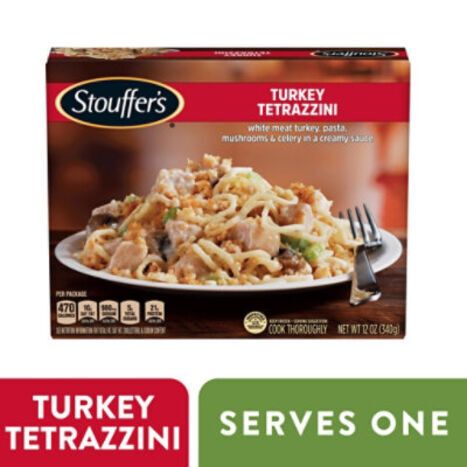 Ingredients: Cooked Pasta (Water, Semolina Wheat Flour, Wheat Gluten), Skim Milk, Cooked Turkey Tenderloins (Turkey Breast Meat, Water, Turkey Flavor, Modified Tapioca & Corn Starch, Salt, Carrageenan), Water, Cream, Celery, Sherry Wine, Mushrooms, Breadcrumbs (Wheat Flour, Sugar, Yeast, Soybean Oil, Salt), Soybean Oil, 2% Or Less Of Modified Cornstarch, Salt, Bleached Wheat Flour, Chicken Fat Flavor (Chicken Fat, Flavors, Chicken Broth), Potassium Chloride, Sugar, Yeast Extract, Spices.