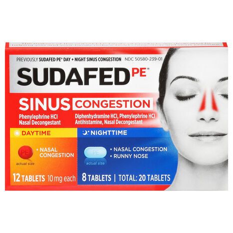 Active Ingredients: (Sudafed PE Daytime): In Each Tablet: Phenylephrine HCl (10 mg). (Sudafed PE Nighttime): In Each Tablet: Diphenhydramine HCl (25 mg), Phenylephrine HCl (10 mg). (Sudafed PE Daytime): Purpose: Nasal Decongestant. (Sudafed PE Nighttime): Purpose: Antihistamine, Nasal Decongestant. Inactive Ingredients: (Sudafed PE Daytime): Carnauba Wax, D&C Yellow 10 Aluminum Lake, FD&C Red 40 Aluminum Lake, FD&C Yellow 6 Aluminum Lake, Magnesium Stearate, Microcrystalline Cellulose, Modified Starch, Polyethylene Glycol, Polyvinyl Alcohol, Powdered Cellulose, Pregelatinized Starch, Sodium Starch Glycolate, Talc, Titanium Dioxide. (Sudafed PE Nighttime): Carnauba Wax, FD&C Blue 1 Aluminum Lake, Magnesium Stearate, Microcrystalline Cellulose, Modified Starch, Polyethylene Glycol, Polyvinyl Alcohol, Powdered Cellulose, Pregelatinized Starch, Sodium Starch Glycolate, Talc, Titanium Dioxide.