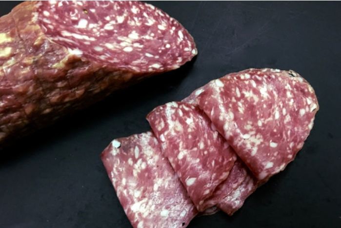 Sweet soppressata is a dry-cured, seasoned pork sausage. It is subtly seasoned with salt, garlic, and black peppercorns and is a nice addition to a charcuterie board or your favorite sandwich.