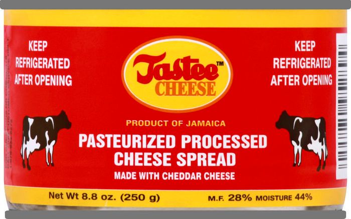 Pasteurized processed cheese spread. Made with cheddar cheese. M.F.: 28%. Moisture: 44%. For questions or comments call our customer service dept. 1-876-934-8272. Product of Jamaica.