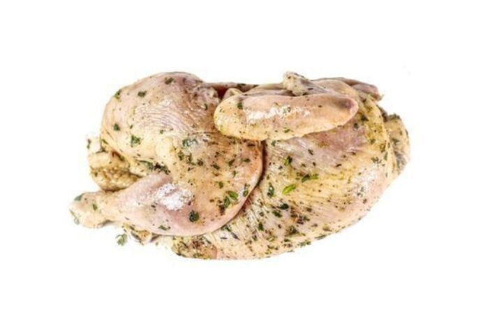 Spatchcocked chicken seasoned with Lemon zest, thyme,rosemary, black pepper and olive oil