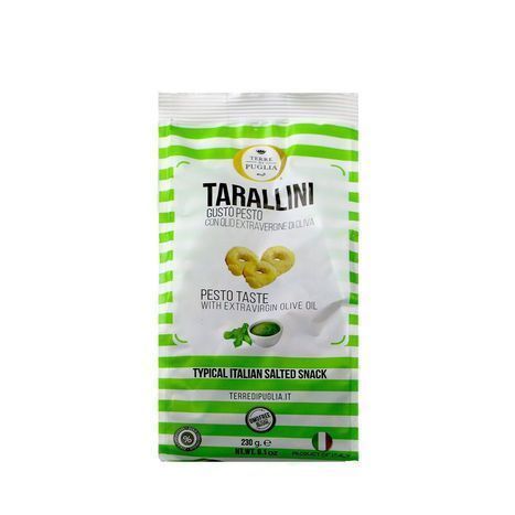 The Tarallini Pesto from Terre di Puglia are traditional snack from Puglia made with durum wheat semolina, basil pesto and extra virgin olive oil. They are shaped into rings, boiled, and finally baked until crispy.