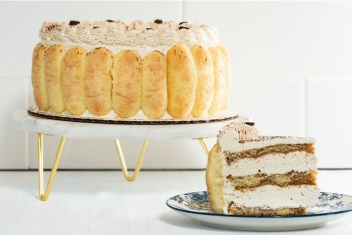 Sponge cake, espresso simple syrup, mascarpone mousse, lady fingers, espresso beans