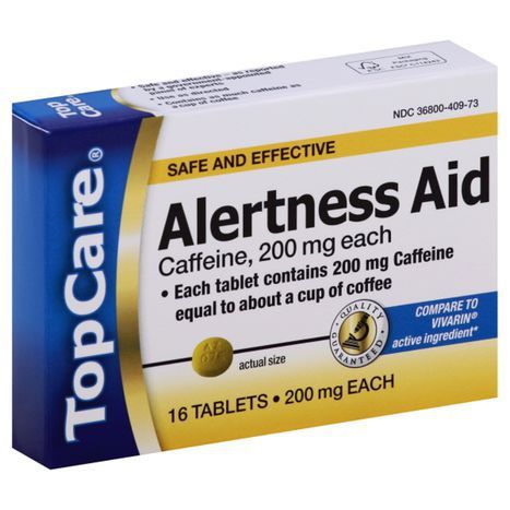 Active Ingredients: In Each Tablet: Caffeine (200 mg). Purpose: Alertness Aid. Inactive Ingredients: Croscarmellose Sodium, D&C Yellow Aluminum Lake, Dicalcium Phosphate, FD&C Yellow 6, Hypromellose, Magnesium Stearate, Microcrystalline Cellulose, Polyethylene Glycol, Silicon Dioxide, Titanium Dioxide.