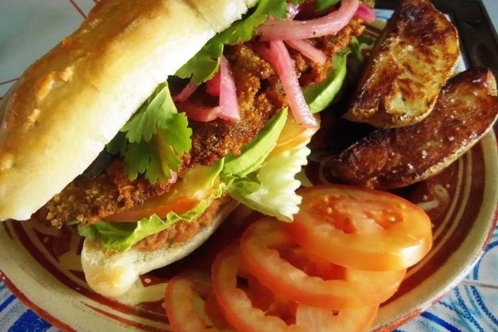 With breaded chicken breast. Made with refried black beans, jalapeno peppers, mayo, avocado, cheese, lettuce and tomatoes in white hero bread