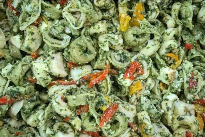 Cheese filled tortellini with our homemade pesto sauce, smoked mozzarella, and roasted red & yellow peppers.