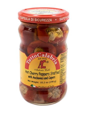 Hot Peppers that are slightly spicy, stuffed with anchovies and capers can be used as a side dish or appetizer. 10.2 oz.