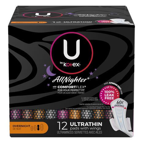 U by Kotex Pads with Wings, Overnight, Ultrathin - 12 Pads