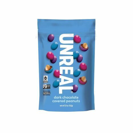 UnReal creates sweet snacks with ingredients that are sustainable never artificial. These vegan Dark Chocolate Peanut Gems get their irresistible crunch from roasted peanuts covered in hardened smooth, dark chocolate, and their vibrant colors from beet juice and spirulina extract. These peanut gems are the perfect morsels for lunches, snacking, or sharing. Dark Chocolate (*Organic Chocolate Liquor, *Evaporated Organic Cane Sugar, *Organic Cocoa Butter, *Organic Vanilla), Roasted Peanuts (Peanuts, Peanut Oil), *Organic Cane Sugar, Gum Acacia, Colored with (Beet Juice, Spirulina Extract), Organic Tapioca Syrup, Carnauba Wax. *Fair Trade Certified By Fair Trade USA. Contains: Peanuts May Contain: Almond, Beech Nut, Brazil Nut, Cashew, Chestnut, Coconut, Eggs, Ginko Nut, Hazelnut, Hickory Nut, Lichee Nut, Macadamia Nut, Milk, Pecan, Pili Nut, Pine Nut, Pistachio, Sheanut, Soybean, Walnut, Wheat