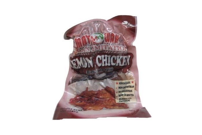 INGREDIENTS: Soybean Fiber, Soybean Protein (Non-GMO), Wheat Protein, Soy Sauce, Mustard Oil, White Pepper Powder, Lemon, Salt, Raw Cane Sugar, Maltose, Vegetable Seasoning. COOKING SUGGESTIONS: Slice pineapple chunks (4 oz) and red bell peppers into small pieces. Stir fry seasonings (2T soy sauce, 3T orange juice concentrate, 2T cornstarch, 1/4T sugar, 1T vegetable oil, 1 1/2 T grated fresh ginger root). Once the seasoning boils, include the vegetables and lemon chicken into wok. Let it boil again and 1/2T of cornstarch water to thicken. Serve and enjoy!