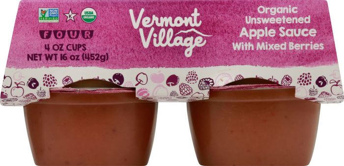 Vermont Village Apple Sauce, Unsweetened, Organic, with Mixed Berries - 4 x 4 Ounce Cups