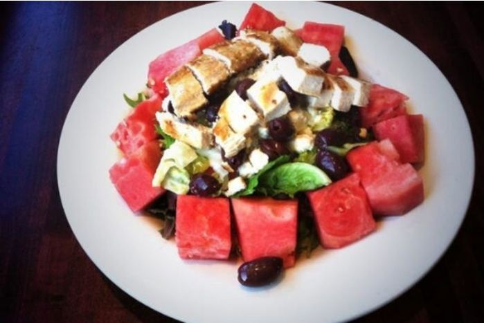 Crumbled Feta Cheese, Kalamata Olives and juicy watermelon pieces atop mixed greens with one of our delicious homemade dressings.