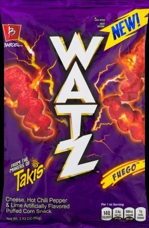 Artificially flavored. Per 1 oz serving: 140 calories; 2.5 g sat fat (13% DV); 900 mg sodium (39% DV); 1 g total sugars. New! From the makers of Takis. Shock things up. Guaranteed fresh until printed date. www.barcel-usa.com. Scan for a shocking surprise! Follow us: Facebook: barcel.usa. Instagram: barcel.usa. Questions or Comments 1-800-354-3372 Weekdays 8:00 am to 8:00 pm EST. Please provide product name, bag size, date, price and numbers found on the bag for each package. Also try: Watz Cheese Shock; Watz Lime Tornado. Dispose of properly. Made in Mexico.