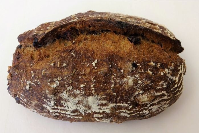 An 80% whole wheat, naturally leavened loaf with cranberries, raisins, and walnuts.