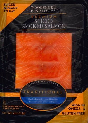 Woodsmoke Provisions Salmon, Premium, Smoked, Traditional, Sliced - 4 Ounces