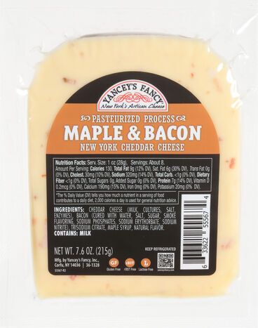 Cheddar Cheese (Milk, Cultures, Salt, Enzymes) Bacon (Cured with Water, Salt, Sodium Phosphate, Sodium Nitrate, Smoke Flavoring, May Contain Sugar, Sodium Ascorbate, Potassium Chloride, Dextrose) Maple Syrup Natural Maple Flavor Trisodium Citrate