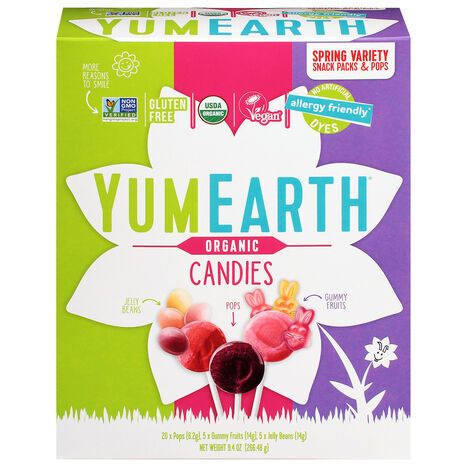 Sour beans. Pops. Gummy fruits. Variety box of assorted snack packs & pops. Gummy Fruits: Very very cherry, perfectly peach, strawberry smash. Pops: Pomegranate pucker, wet face watermelon, strawberry smash, googly grape, very very cherry. Sour Beans: Pomegranate pucker, perfectly peach, mango tango, awesome apple. Gluten free., Vegan., No nuts., No high fructose corn syrup., Dye free., USDA Organic., Gummy Fruits: Certified Organic by Ecocert France SAS., Pop: Certified Organic by Oregon Tilth., Sour Beans: Certified Organic by Ecocert SA., Allergy friendly., Organic & non-GMO. Non GMO Project verified. Nongmoproject.org. Snack packs & pops. More reasons to smile., Snack packs & pops. More reasons to smile. Sweet. Simple. Smiles., Made with no: soy; egg; dairy; shellfish; peanuts; artificial dyes; high fructose corn syrup. yumearth.com Please share your smiles with us! Yumearth.com. (at)yumearth. Visit yumearth.com FAQs for complete packaging and manufacturing info. Gummy Fruits: Product of France., Pop: Product of Mexico., Sour Beans: Product of Mexico.
