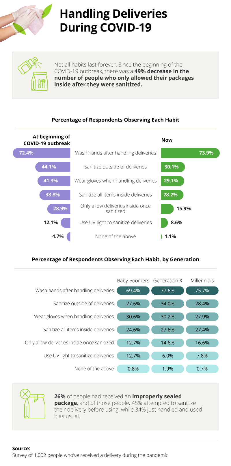 We surveyed 1,002 respondents who indicated they had received a package or delivery during COVID-19 in order to explore how people are typically interacting with food, package, or grocery delivery workers and how they are handling these packages during COVID-19.