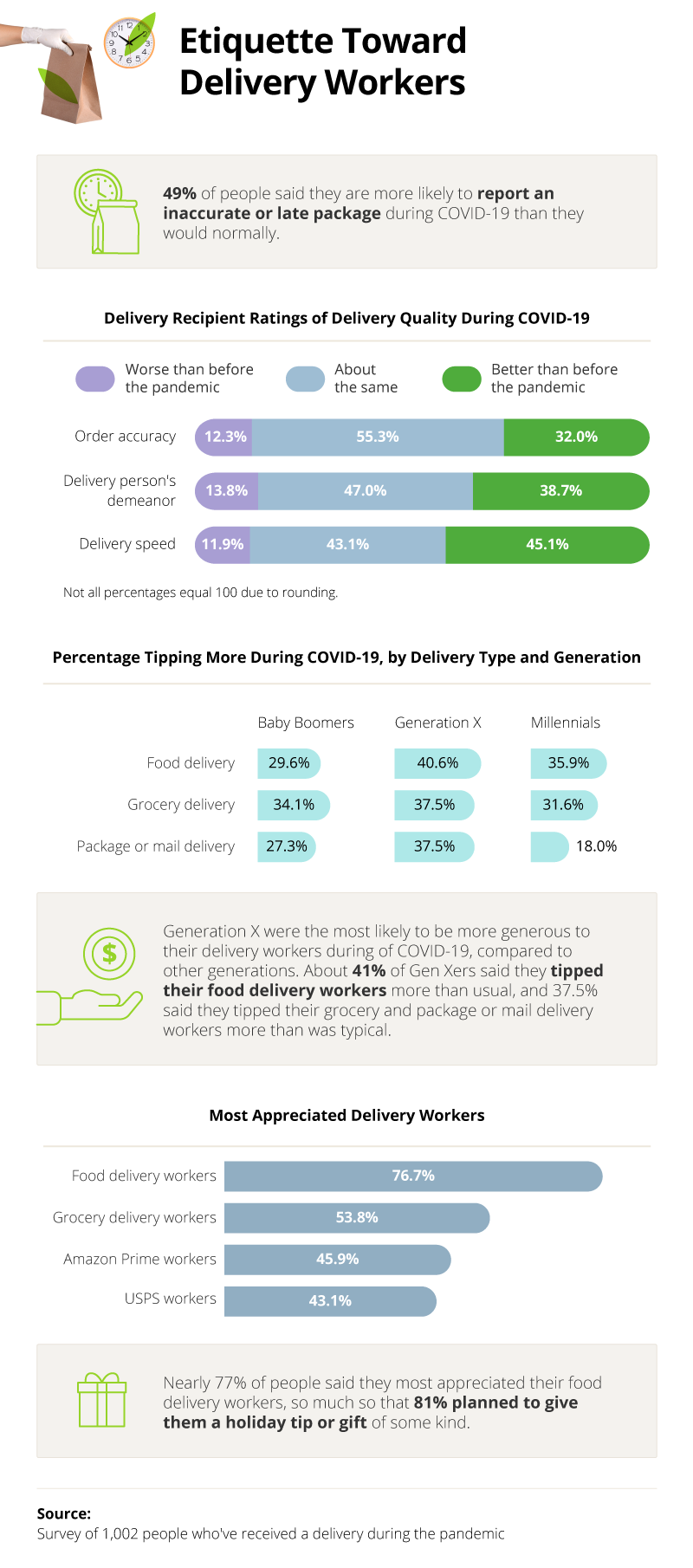 Despite the better service, people didn’t always give delivery workers more slack. Nearly half of people said they were more likely to report an inaccurate or late package during COVID-19 than they would normally.