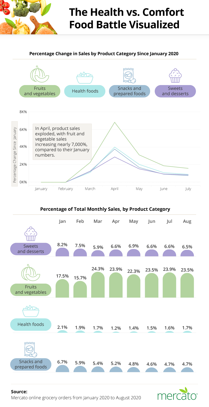 That trend can be hard to determine when the sales of grocery products boom due to a pandemic and stockpiling, which can be seen across both comfort food and healthy categories since January of 2020: