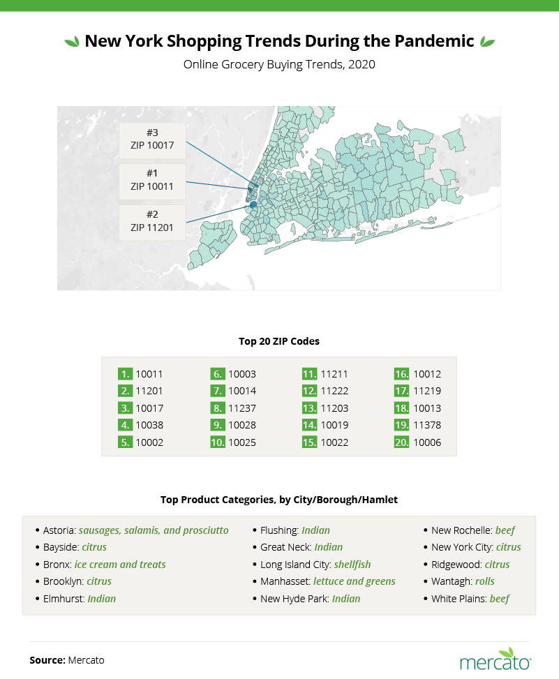 ZIP code 10011 in the Chelsea neighborhood of NYC started online shopping the most, or at least increased their online sales the most, during the height of the pandemic.