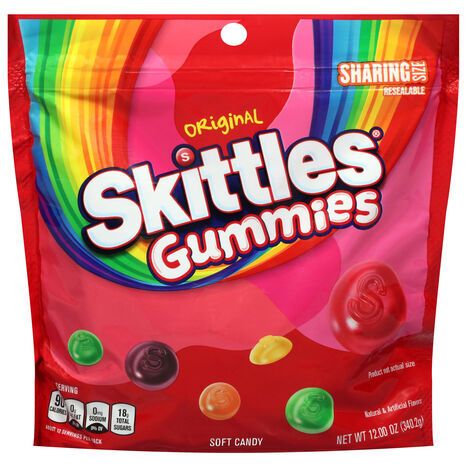 Grape, Lemon, Green Apple, Strawberry, Orange. Natural & artificial flavors. About 12 servings per bag. Per Serving: 90 calories; 0 g sat fat (20% DV); 0 mg sodium (0% DV); 18 g total sugars. Contains bioengineered food ingredients. New. www.skittles.com. www.twitter.com/skittles. Questions? Comments? Call 1-800-974-4539. Resealable. Dispose of properly. Made in Mexico.