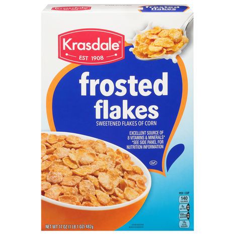 Sweetened flakes of corn. Per 1 Cup: 140 calories; 0 g sat fat (0% DV); 150 mg sodium (7% DV); 14 g total sugars. Excellent source of 8 vitamin & minerals (See side panel for nutrition information). Est 1908. This product is sold by weight, not volume. Some settling of contents may have occurred during handling and shipping. krasdalefoods.com. BHT added to packaing to help preserve freshness Packaged in USA.