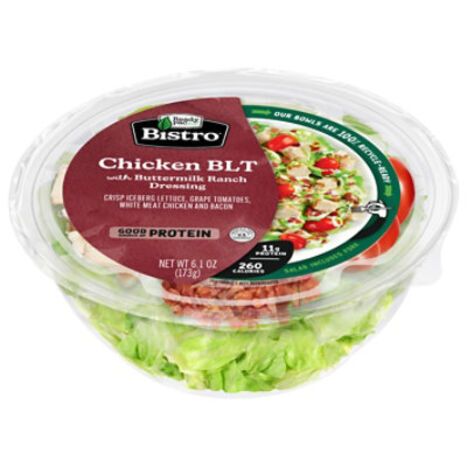 Iceberg Lettuce, Ranch Dressing (Soybean Oil, Water, Distilled Vinegar, Egg Yolks, Soy Sauce [Water, Wheat, Soybean, and Salt], Sugar, Buttermilk, Contains Less than 2% of Salt, Garlic Juice, Onion Juice, Nonfat Dry Milk, Lactic Acid, Spice, Dehydrated Parsley, Xanthan Gum, Sour Cream [Cream, Nonfat Milk Cultures], Natural Flavor [Includes Milk]), Grape Tomatoes, Chicken Breast with Rib Meat (Chicken Breast Meat with Rib Meat, Water, Sodium Lactate, Seasoning [Salt, Sugar, Artificial Chicken Flavor {Hydrolyzed Corn Protein, Autolyzed Yeast Extract, Thiamine Hydrochloride, Disodium Inosinate, Disodium Guanylate}, Dextrose, Natural Flavoring], Modified Potato Starch, Dextrose, Potassium Lactate, Sodium Phosphates Sodium Diacetate), Bacon (Cured with Water, Salt, Sodium Phosphates, Sodium Erythorbate, Sodium Nitrite, May Also Contain: Sugar, Brown Sugar, and Natural Smoke Flavor).