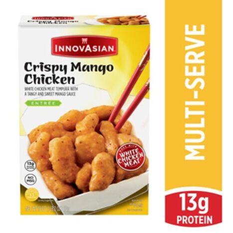 Chicken: Chicken Breast Meat, Water, Cornstarch, Bleached Enriched Flour (Wheat Flour, Niacin, Iron, Thiamine Mononitrate, Riboflavin, Folic Acid), Contains Less than 2% of Dextrin, Egg Whites, Egg Yolks, Leavening (Sodium Acid Pyrophosphate, Sodium Bicarbonate, Monocalcium Phosphate), Modified Potato Starch, Nonfat Dry Milk, Rice Flour, Salt, Sodium Phosphate, Xanthan Gum, Cooked in Vegetable Oil, Sauce: Water, Sugar, Mango Puree, Modified Corn Starch, Orange Juice Concentrate, Distilled Vinegar, Salt, Garlic Powder, Jalapeno Puree (Red Jalapeno Peppers, Citric Acid), Onion Powder, Spices, Citric Acid, Natural Flavor.