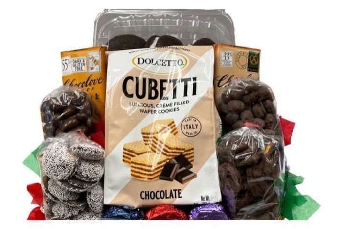 Dripping in chocolate decadence, this chocoholic basket includes a selection of gourmet chocolate treats second to none! Two thick chocolate bars, Cubetti chocolate wafer cookies, milk chocolate almonds, double dipped milk chocolate peanuts, milk chocolate pretzels, and chocolate nonpareils are topped off with Chocolate Covered Oreo’s and Wilson Farm’s very own whoopie pies, making this the ideal sinfully delicious basket.